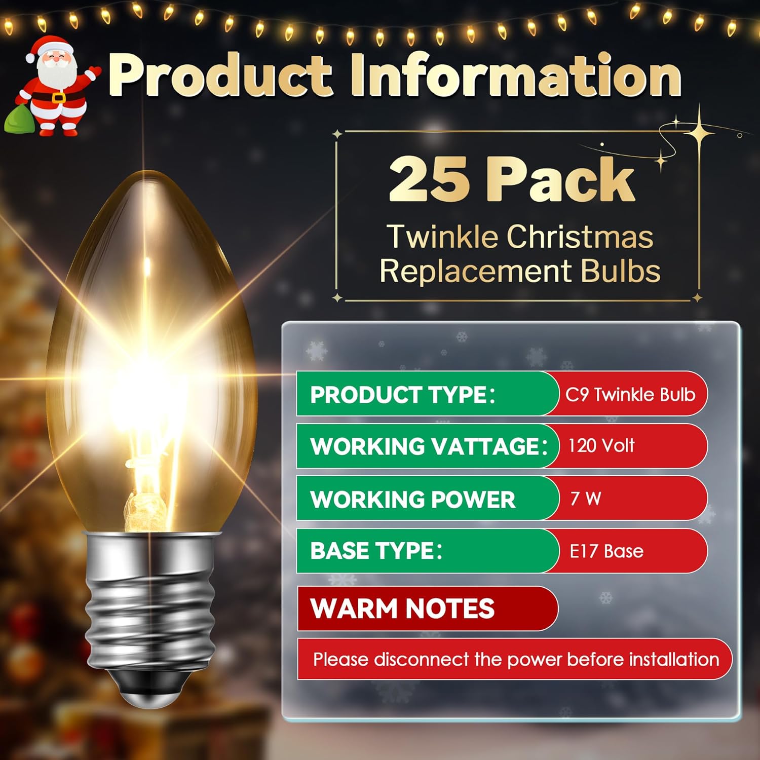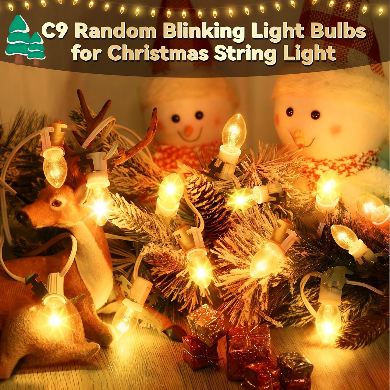 Working Principle: These C9 Incandescent bulbs have colorful lighting effects, not only can be applied as festive decorations, but also can be applied for night lighting, very suitable for Christmas parties, creating a strong and romantic Christmas atmosphere for your family. They are made of quality materials, not easy to break, and can withstand the outdoor environment, no matter what the weather conditions, these bulbs will continue to glow steadily, besides keeping it for your own use, you can also share this C9 Incandescent bulb with your family and neighbors. Specification: Material: Glass Color: transparent Quantity: 25 sets Features: Random Blinking Light Bulbs