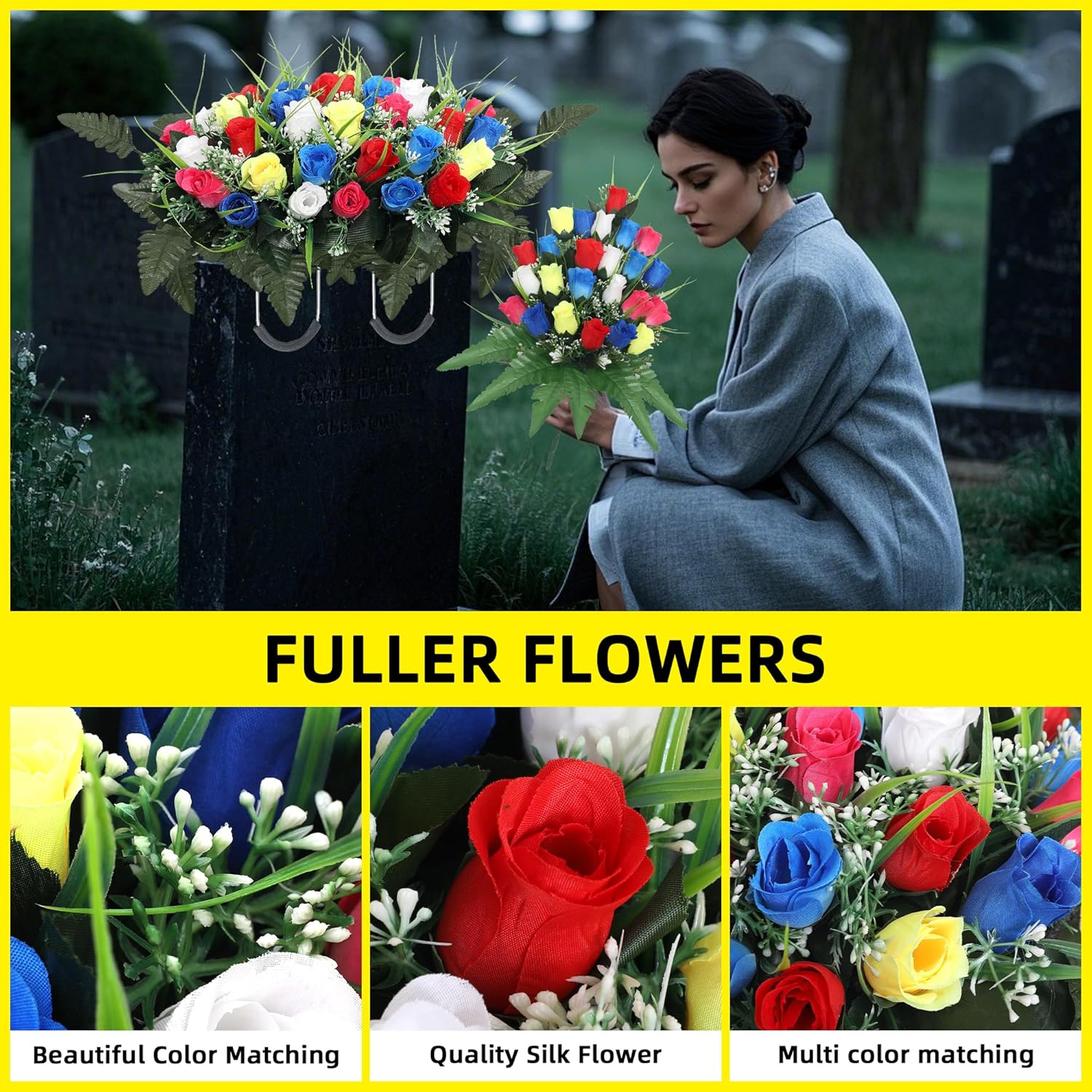 Feature: Material:The grave flowers made of silk flower,vibrant and look natural Long lasting: artificial cemetery flowers can look fresh for 60-90+ days Size: The cemetery saddles for headstones: 28L x 20W x 9H IN;suitable for 17-30 cm/6.69-11.81 inches thick tombstones);unafraid of strong windsThe grave flowers height: 47cm/18.5,24 heads in a bouquet.Vase height: 11”,Grave vase has a 2.8”long ground spike, NO MAINTENANCE:There silk flowers offer a lasting,beautiful display with no upkeep Tombstone flowers saddle for Mother's Day, Father's Day, Valentine's Day, Thanksgiving, Christmas, Memorial Day Package includes: 1 x headstone flower saddle 2x silk cemetery flowers Bouquets 2x cemetery Vases