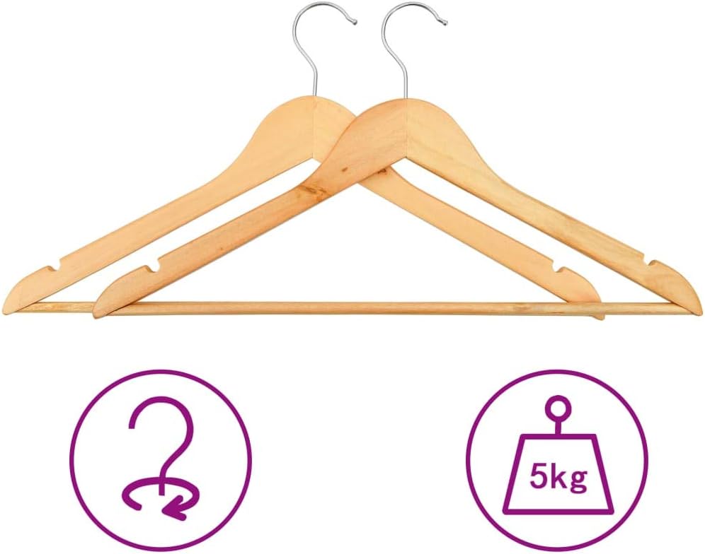 This wooden set of hangers is made of hardwood and metal, keeping it durable and sturdy enough to withstand the weight of heavy. The 360 degrees rotatable hook provides flexibility to organize your clothing in various places. Also, 2 grooves on both sides prevent the clothes or clothing accessories to slide off.Additionally, the cylindrical design bar avoids creases and adds other hanging option for trousers, bed sheets, blankets etc.Color: Light brownMaterial: Hardwood, metalOverall dimensions: 17.5"x0.2"x9.1" (W x D x H)Hook size: 2"x2.8" (W x H)Loading capacity: 11 lbWith 2 non-slip notches and 1 trouser bar360 degrees rotating hookDelivery contains:50 x Hanger