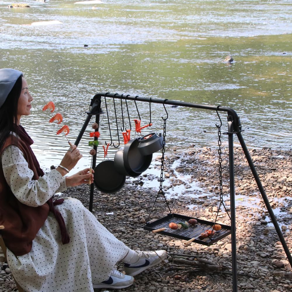 1 MATERIAL: This swing grill campfire cooking table is made of high quality carbon steel material, sturdy and durable, high temperature resistant, can be directly used for campfire.2 ADJUSTABLE DESIGN: This BBQ grill swing cooking table comes with a convenient swing grill, a chain latch for elevation and a lower grill height. You can adjust the height of the campfire grill as needed to control the cooking temperature3 PRACTICAL CAMPFIRE GRILL: Outdoor portable folding grill allows you to cook hot meals with ease. Designed for use with outdoor cookware, skillets, frying pans and pots, cooking over an open fire.4 EASY TO USE: Outdoor cooking equipment can be easily set up, six hooks can hold grilling tools. Features a stable A-frame construction, suitable for a variety of terrains such as beaches, grass, slopes, etc., and can also be used in the backyard.