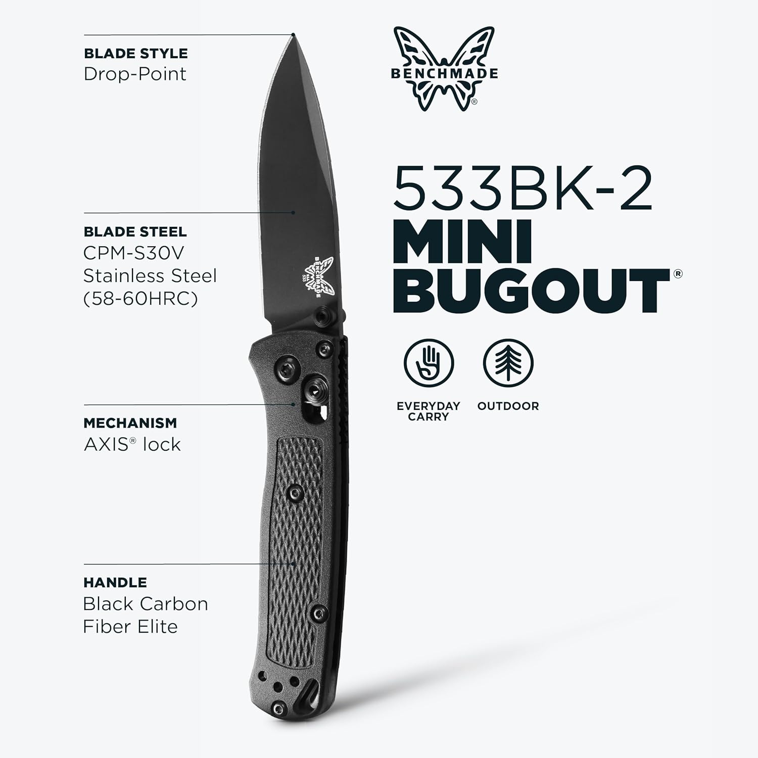 The 533BK-2 Mini Bugout® packs a mean punch, and does it with class. So don’t let it’s size fool you. Wrapped in black and tipping the scales at an ounce and half, this pint sized slicer takes ultralight performance to the next level. With it's Ambidextrous thumb stud, This Mini Bugout is perfect for everyone! Re-engineered with Benchmade’s new CF-Elite™ handle technology, the 535BK-2 weighs in slightly lighter than its predecessors, yet boasts greater rigidity under pressure. Just when you thought the Bugout couldn’t get any lighter.