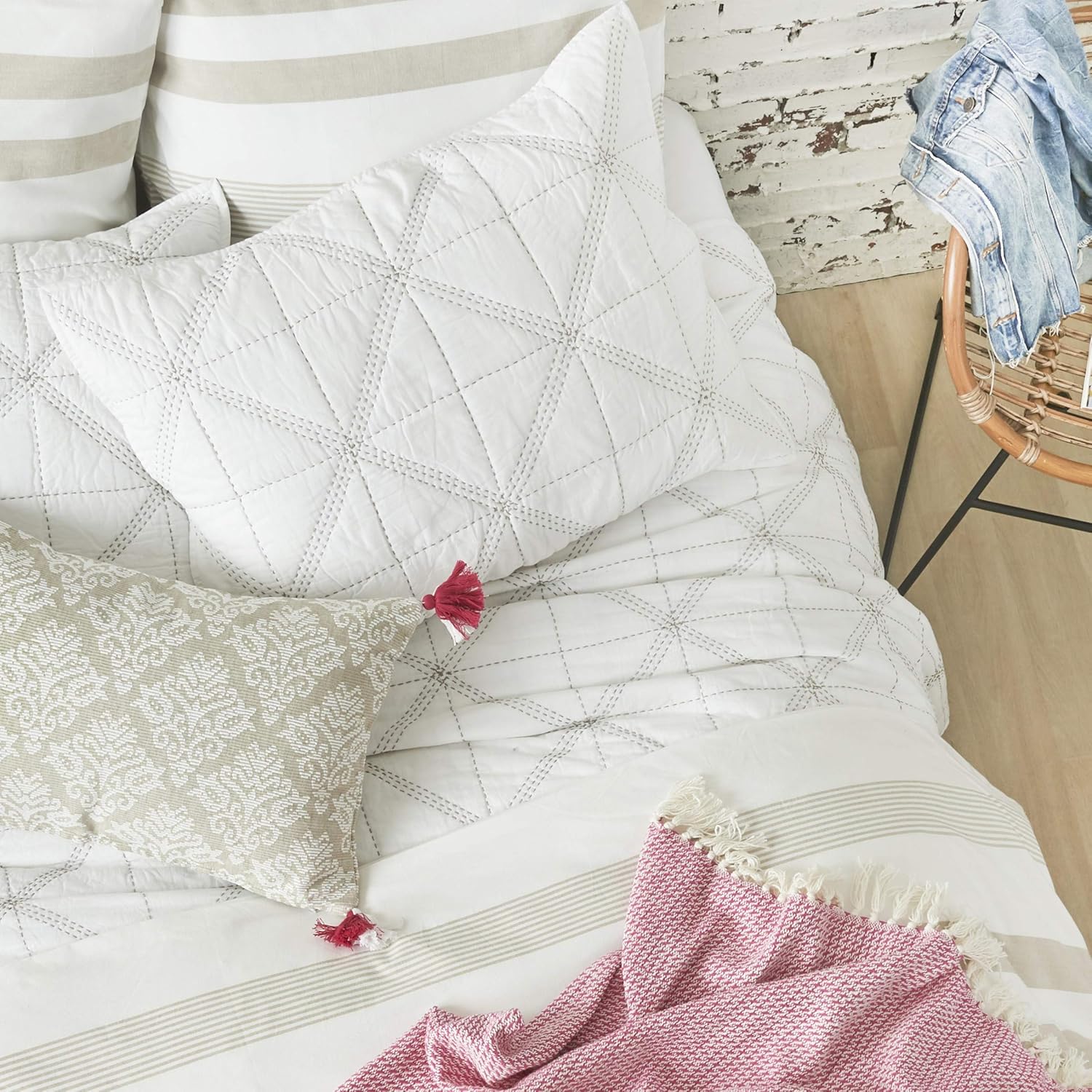 Preppy, polished, and perfect for layering, the Harper quilt is crafted of 100-percent white cotton voile with a neutral geometric stitched pattern, which coordinates flawlessly with carol & frank's Dune colorway. Style this luxury oversized quilt with the rest of the Harper Collection for a clean, tailored look, or mix and match with other patterns and colors to create a personalized look that suits your lifestyle. Different is beautiful! Each quilt is individually quilted by hand, no two pieces are alike, therefore any irregularities should be seen as unique beautifications.