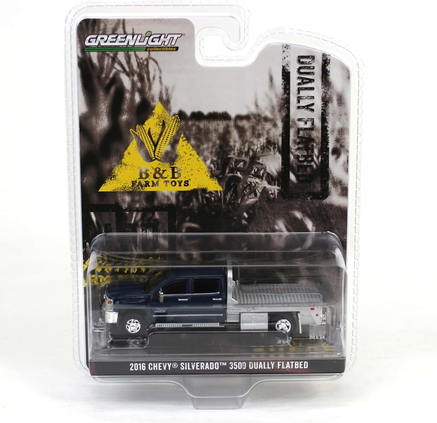 This 1/64 scale 2016 Silverado 3500 Dually Flatbed in blue is a B&B Farm Toys exclusive, manufactured by Greenlight Collectibles. Featuring a diecast metal chassis, rubber tires, and detailed plastic components, it’s a great addition to any collection. Measuring approximately 4 inches long, this model is designed for display and is recommended for ages 14 and up.