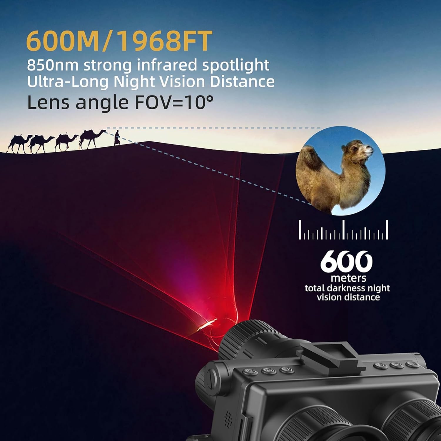 ★ Product Specification:Aperture: F1.0 large apertureFocal Length: f=25mmElectronic Zoom: 8-levelSize: 1.28-inch dual circular screenResolution: 416x416Observation Modes:Day Mode/Low Light Mode/Night Mode (with 3 levels, customizable to 7 levels)Screen Brightness Adjustment: Adjustable to 5 different levelsInfrared Auxiliary Distance: 1-1000m (varying with target and environment)Power Supply Options:Supports Powerbank, DC, car charger, etc.Battery Status Indicators: Low Battery Indicator: YesButton Features: Button Backlight: Blue light, adjustable on/offAudio Capabilities: Speaker: Yes, adjustable volume, adjustable on/offAudio Recording: YesLanguage Support: 12 languages availableBattery Specification:Type: Removable 18650 batteryVoltage Range: 2.6-4.2VCapacity: 3000mAhStandby Time: Approx. 10 hoursAdditional Features:Memory Card Slot: TF card, supports 4G-128GUSB Port: TYPE-CExternal Tripod Mount: Supported (1/4 inch screw)Head-Mounted Design: Yes★ Package List:1 * Night Vision Binocular1 * 32GB Memory Card1 * USB Cable1 * Cleaning Cloth1 * Storage Case1 * User Manual