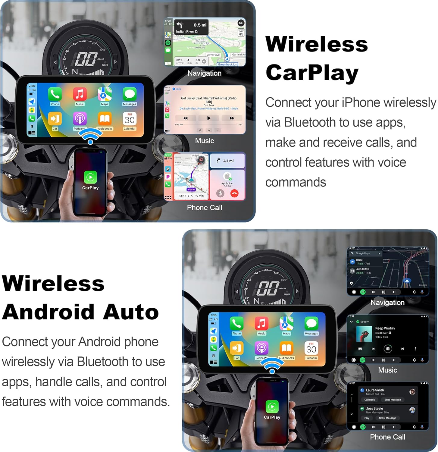 Mt5A 6.25" Wireless CarPlay & Android Auto Screen with 1080P Cameras, TPMS & External GPS for Motorcycles Elevate your riding experience with the Mt5A smart display—a compact 6.25-inch navigation, recording, and safety hub engineered for riders who demand comprehensive situational awareness. This rugged, IP67 waterproof touchscreen combines seamless wireless connectivity, built-in front/rear cameras, real-time tire pressure monitoring, an external GPS antenna for enhanced positioning, and intuitive screen mirroring, transforming your handlebars into a fully connected digital command center. Key Features:Wireless Apple CarPlay & Android Auto: Enjoy cable-free access to Apple CarPlay (iPhone 6+, iOS 10.0+) and Android Auto (Android 11.0+), with full control via touchscreen or voice commands (Siri/Google Assistant). Navigate unfamiliar roads, stream music, make calls, and hear messages hands-free—keeping your focus on the ride ahead.1080P Front & Rear Dash Cameras: Capture every journey with 1080P front and rear cameras. Automatic loop recording ensures continuous footage of your rides, providing valuable evidence in case of incidents and letting you relive scenic routes.Real-Time TPMS Monitoring: Stay informed of your tire conditions with TPMS (Tire Pressure Monitoring System) compatibility. Real-time pressure and temperature alerts help you catch potential issues before they become problems, adding an essential layer of safety to every ride. The standard package includes two TPMS sensors suitable for most motorcycles.External GPS Antenna for Enhanced Positioning: Navigate with confidence using the included external GPS antenna. Delivering faster signal acquisition and more accurate positioning, it ensures reliable speed display and navigation.6.25" 800-Nit High-Brightness IPS Display: See every detail with clarity in various lighting conditions. The 6.25-inch IPS touchscreen delivers crisp 1560×720 resolution with 800 nits of brightness, ensuring excellent visibility. The anti-glare coating and glove-friendly touch response allow for easy operation even with riding gloves, while automatic night mode reduces eye strain during evening rides.Bluetooth 4.2 for Stable Audio: Enjoy hands-free calls and music with reliable Bluetooth 4.2 connectivity. Audio routes directly from your phone to your helmet headset for clear transmission, keeping you informed and entertained without distraction during your rides.Wireless Screen Mirroring: Extend your smartphone's functionality beyond standard CarPlay limits with AirPlay (iPhone) and AutoLink (Android) mirroring, casting any app directly to the display for greater flexibility on the road.IP67 Waterproof & Rugged Construction: Built to withstand the elements with an IP67 waterproof and dustproof rating, the Mt5A performs reliably in heavy rain, dust, and mud. With an operating temperature range of -20°C to 80°C, it's ready for year-round riding in diverse conditions.Global Language & Voltage Support: Ready for journeys anywhere. The Mt5A supports over 12 languages and accepts 5V/12V input, making it compatible with motorcycles worldwide. Simple installation gets you on the road in minutes.12-Month Warranty & Reliable Support: Every Mt5A purchase includes a 12-month warranty and email support with quick response times, ensuring assistance whenever you need it—on the road or off. Whether commuting through city traffic or embarking on weekend adventures, the Mt5A delivers a bright, responsive display, built-in ride recording, real-time tire monitoring, enhanced GPS precision, seamless connectivity, and dependable performance for riders who want comprehensive safety features in a compact, versatile package.