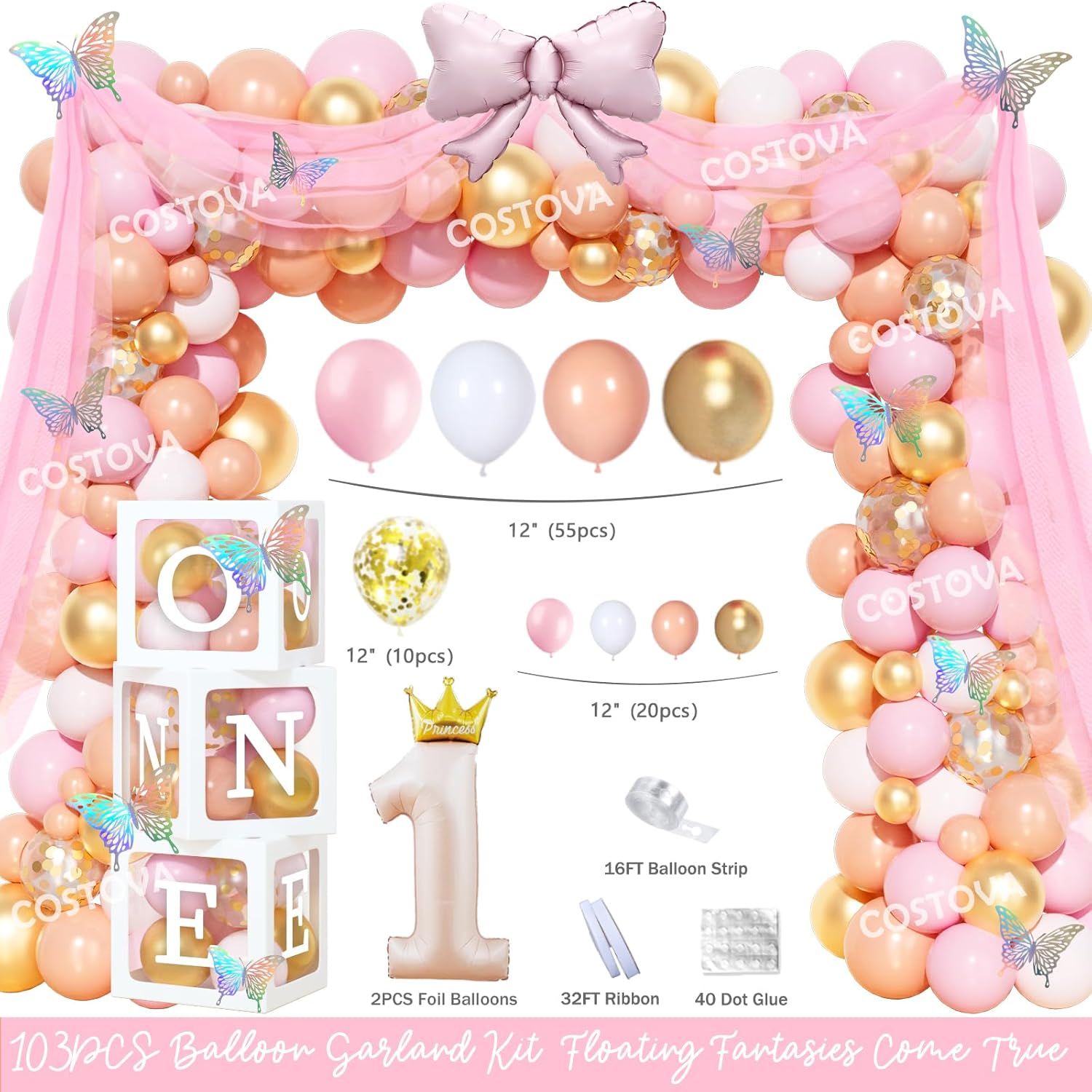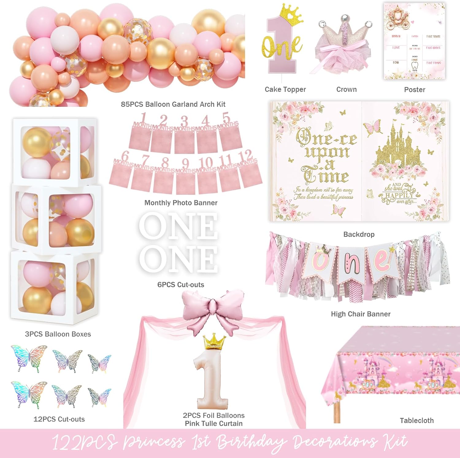 | Included Components | Castle Tablecloth, Photo & Highchair Banner, One-ce Upon a Time Backdrop, cake topper, Pink & Peach Pink & Gold Galloons, Tulle Curtain, Princess 1 & Bow Foil Balloons, Poster, Boxes, Princess 1st Birthday Party Decorations |