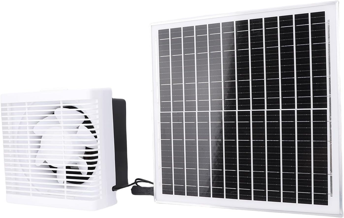 1. Efficient Ventilation Solution: Our solar powered exhaust fan effectively removes hot air and odors from chicken coops, greenhouses, sheds pet houses and windows, bringing in air without electricity costs. 2. Outdoor Performance: Featuring IP67 water proof rating, this fan withstands outdoor conditions, ensuring reliable operation in rain or shine. 3. Plug and Play Installation: Simply connect the solar panel to the fan and place in sunlight, wiring or technical skills required for immediate ventilation. 4. Smart Solar Adaptation: Fan speed automatically adjusts to sunlight strength, providing strong airflow during maximum daylight hours while energy when light is weak. 5. Sturdy Lightweight Construction: Made with quality plastic and aluminum alloy, this fan combines with portability for long lasting performance in various environments. Specification: Item Type: Solar Panel Ventilation Fan Kit Material: Plastic, Aluminum Alloy Current: 0.6A Power: 7.2W Rotation Speed: 1500 RPM Maximum Power (Pm): 20W Maximum Power Current (Imp): 1.67A Short Circuit Current (Is c): 1.87A Solar Panel Size: Approx. 35x35x1.5cm / 13.78x13.78x0.59in Fan Size: Approx. 23.5x23.5x7cm / 9.25x9.25x2.76in, 19.2x8.7cm / 7.56x3.43in Solar Panel: No electricity storage function Application: Suitable for small chicken coops, greenhouses, sheds, pet houses, and window exhaust systems. Weight: Approx. 2355.00g / 83.07oz How to Use: 1. Install the solar panel at a 90° angle to maximize solar charging efficiency. 2. Connect the and negative terminals properly. The fan will automatically operate through solar power generation when exposed to direct sunlight, strong sunlight results in quick rotation speed. 3. If there's no sunlight, the fan will not rotate. Simply turn on the exhaust fan switch manually when needed. Package List: 6 x Screws 4 x Plastic