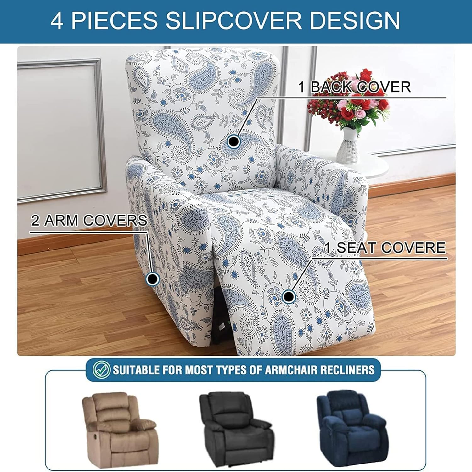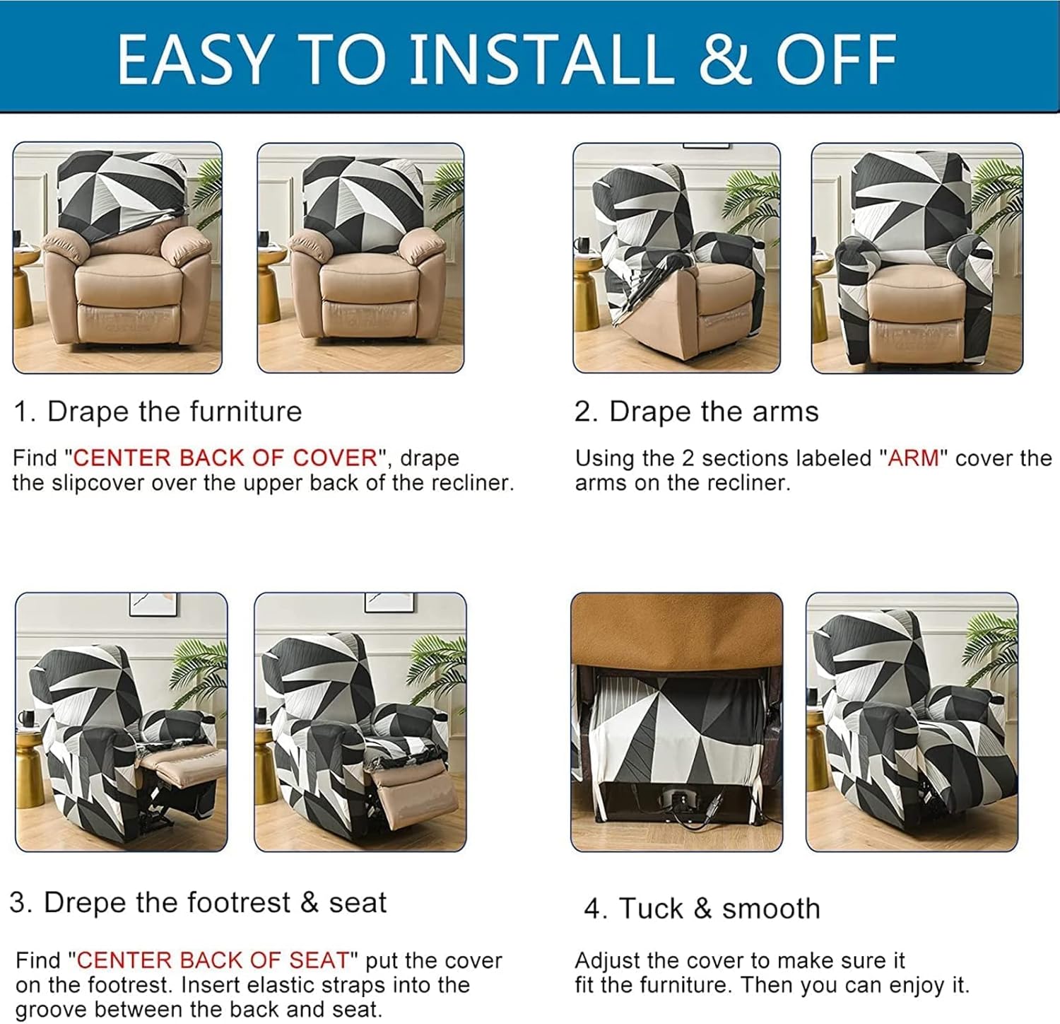 4 Piece design:These creative 4 Pieces recliner covers are sophisticated designed, including 2 Pieces arm covers,1 Pieces Back covers and 1 Pieces Seat covers.Features:1. Made of ultra soft and gentle polyester spandex fabric, soft and skin-friendly to touch, breathable and comfortable.2. Has a footrest that has pleats at the front corners to help the fabric wrap beneath the furniture.3. The entire base including footrest has elastic sewn to the perimeter to help wrap under the furniture4. Easy to install, with instructional tags to seamlessly guide you through the installation process.Size:Recliner Length: 27-39inch (69-99cm)Recliner Width: 30-40inch (76-101cm)Recliner Height: 40-50inch (101-127cm)Fit manual and electric styles reclinersNote:1. To make sure getting the perfect fitting, kindly measure the width of your sofa (outside arm to outside arm, straight cross) before purchasing.2. Machine washable in cold water. Wash separately at gentle cycle, do not use bleach and iron. Using mild laundry detergent.