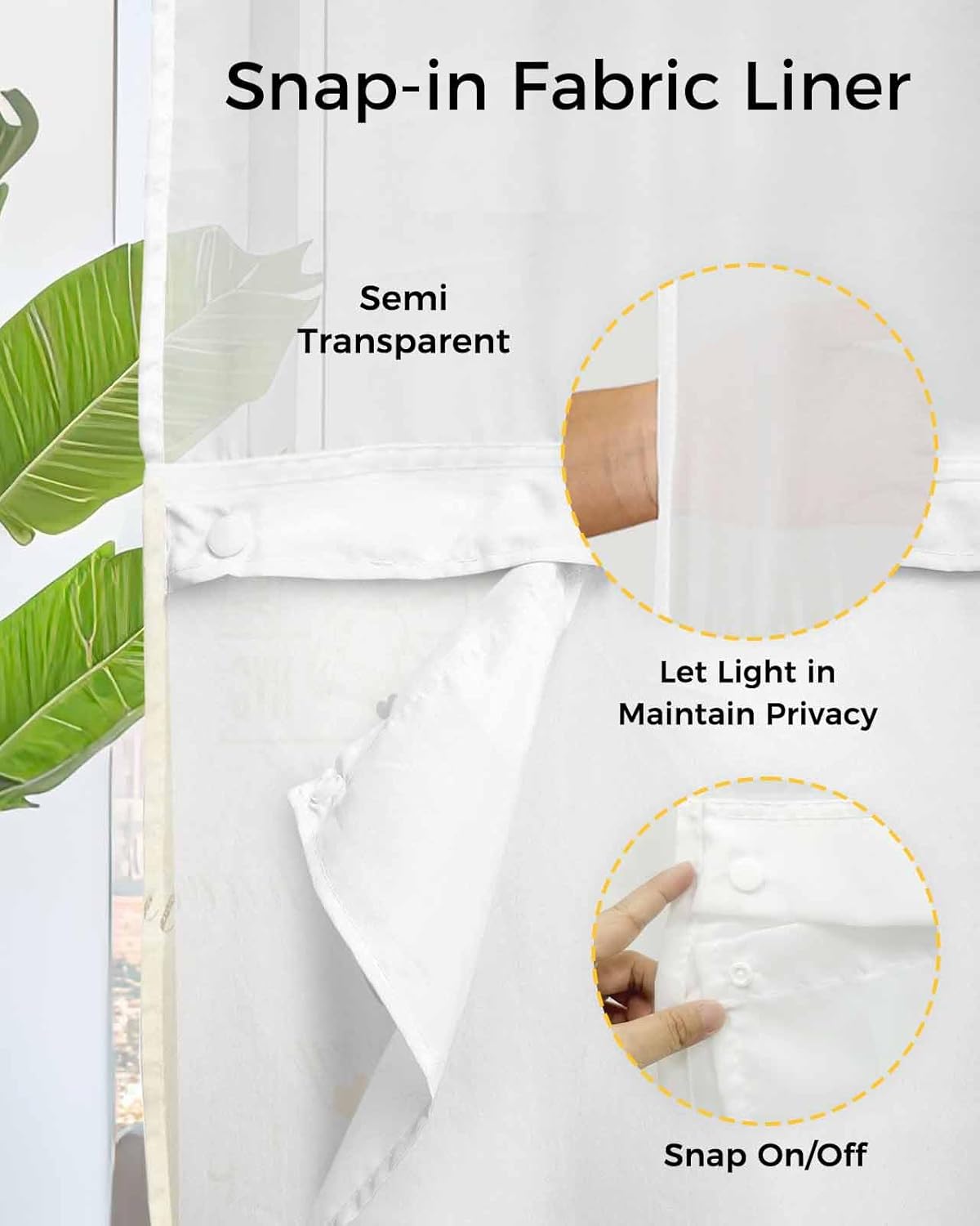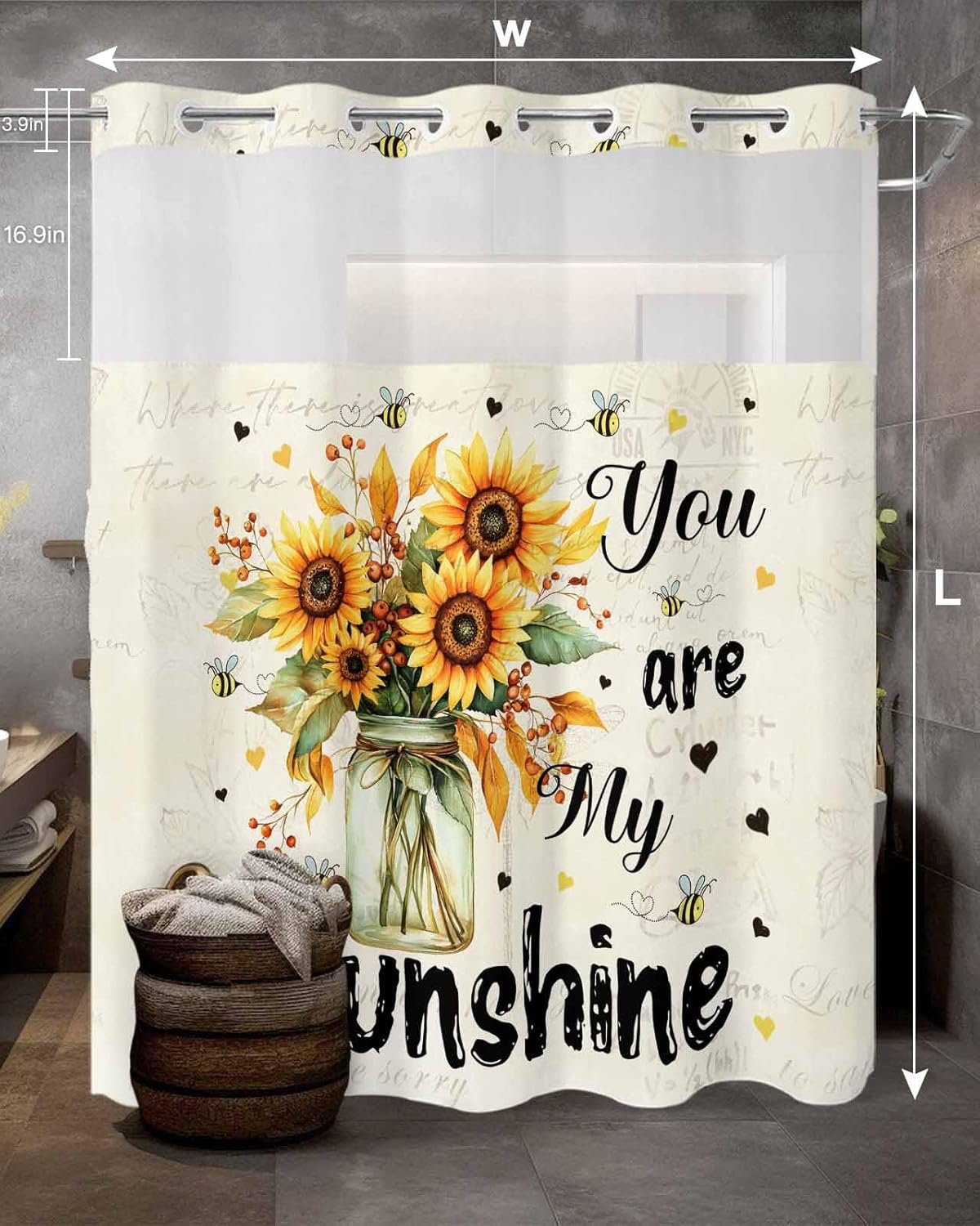 Sunnmer Sunflowers No Hook Shower Curtains with Snap in Liner for Bathroom Shower Room SIZE CHOOSE: 1 shower curtain 36" x 72" + 1 fabric snap-on replacement liner 1 shower curtain 36" x 78" + 1 fabric snap-on replacement liner 1 shower curtain 48" x 72" + 1 fabric snap-on replacement liner 1 shower curtain 54" x 78" + 1 fabric snap-on replacement liner 1 shower curtain 60" x 72" + 1 fabric snap-on replacement liner 1 shower curtain 66" x 72" + 1 fabric snap-on replacement liner 1 shower curtain 72" x 72" + 1 fabric snap-on replacement liner 1 shower curtain 72" x 78" + 1 fabric snap-on replacement liner 1 shower curtain 72" x 84" + 1 fabric snap-on replacement liner 1 shower curtain 72" x 96" + 1 fabric snap-on replacement liner EASY TO INSTALL:With snaps,the fabric liner is easy to remove and install.And the fabric liner is constructed with magnets on corners, so when you're in the shower, the liner with magnets will make water quickly run across the surface without wetting the outer shower curtain and floor.Besides, no hook design effortlessly hooks up the shower curtain on the rod within seconds, no extra hooks required, saving time and strength for you guys SEE THROUGH MESH TOP WINDOW:The sheer gauze at the top of the shower curtain lets light in and allows air to circulate, creating a unique spa shower experience while maintaining privacy and breathability STYLISH PATTERN DESIGN: Our shower curtain is printed with sunflowers, leaves and bees, whose vibrant color and rustic design will make your shower room more charming, bringing you an unique and different showering experience EASY TO CARE:Our shower curtain can be machine washable in gentle mode. You just need to remember not to do bleach and to do low temperature ironing