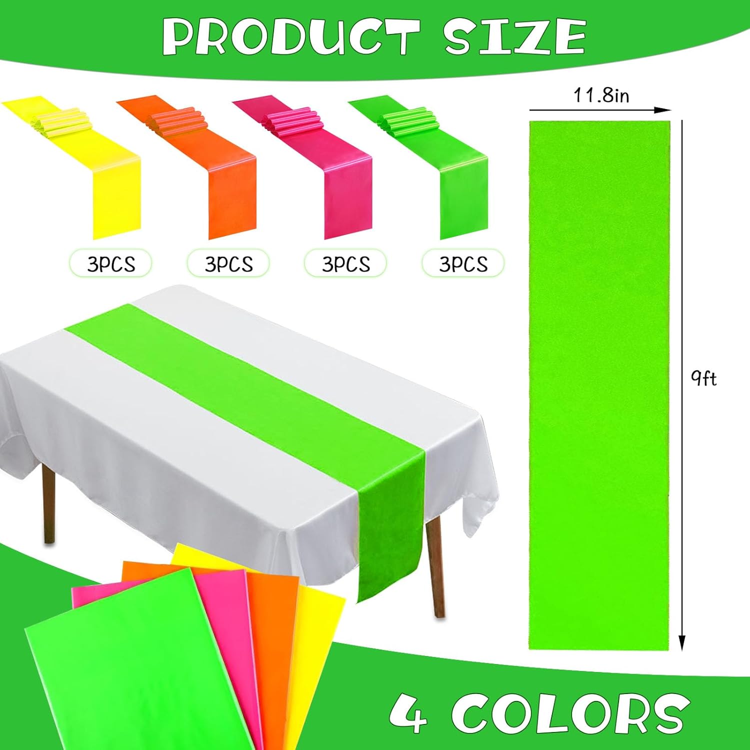 Features:These bright color satin silk table runners can be used indoors or outdoors or to decorate your table for any dinner party. Make your party more fun and attractive! The satin table runners in colors are perfect for neon glow party, weddings, birthday parties, family gatherings, bridal showers, receptions, family dinners, parties and moreSpecifications: Material: polyester satin Color: as the pictures shownPackage Including: 12 x Satin silk table runners