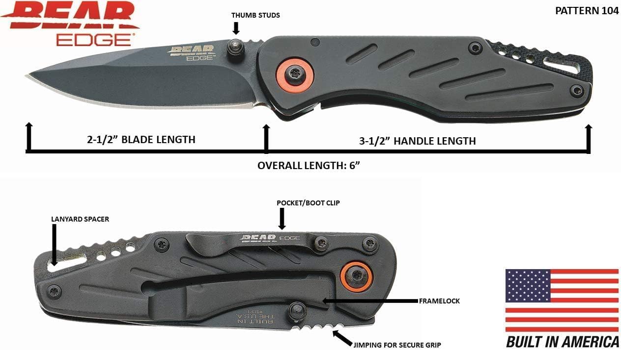 The Bear edge 61104 440 stainless steel frame lock knife features stainless steel frame with 440 stainless steel Black coated blade, lightweight construction, and proudly built in the USA.