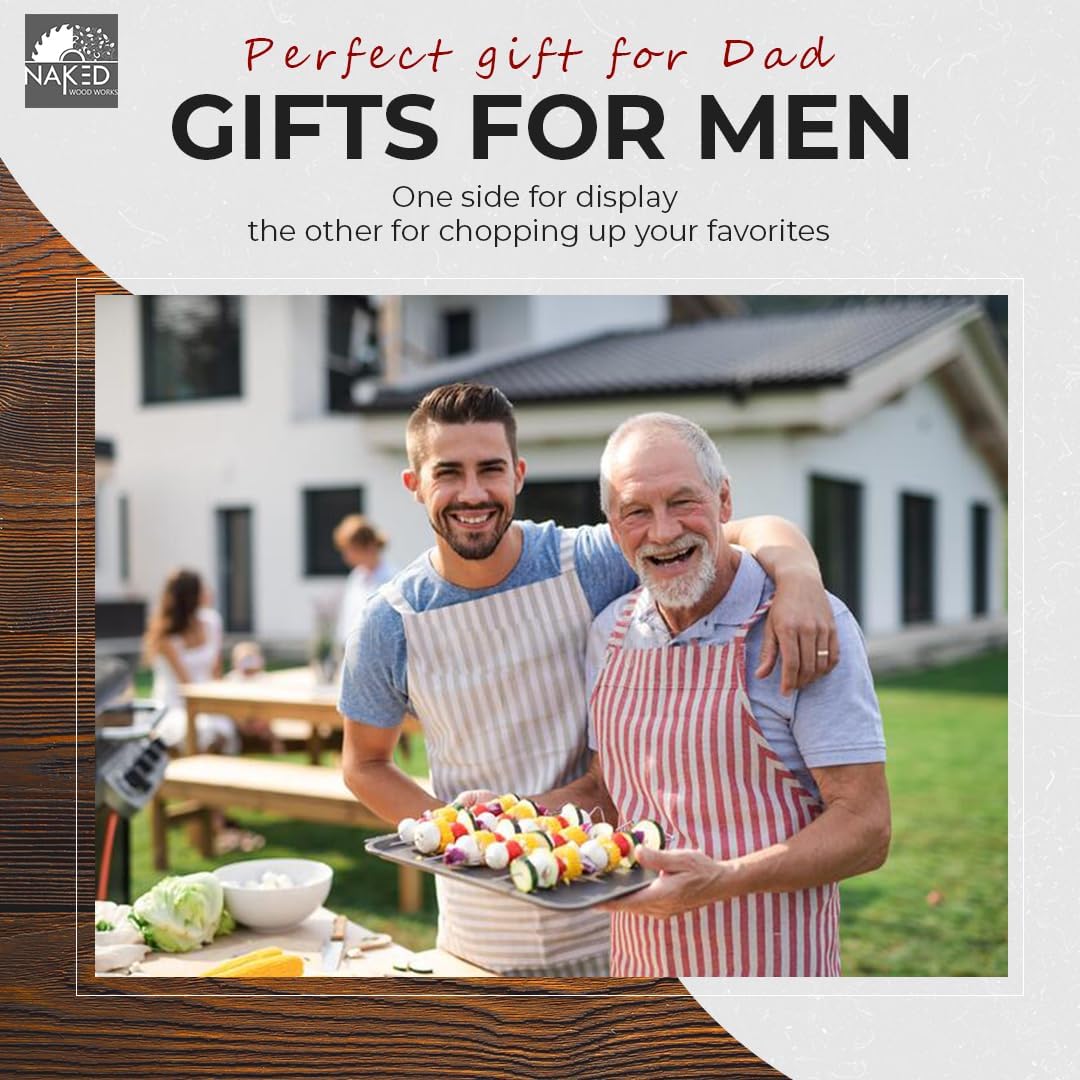 Handcrafted in the USA: Proudly made from premium walnut or maple hardwood, ensuring durability and a beautiful finish. Customizable: Personalize with your dad's name or a special message, making it a one-of-a-kind gift that will be cherished for years. Versatile Sizes: Standard: 10" x 14" x 0.75" โ Perfect for everyday use and kitchen decor. Compact: 8" x 12" x 0.75" โ Easy to store in cabinets. Large: 12" x 16" x 1.5" โ Featured in photos, providing ample space. Extra-Large: 16" x 24" x 1.5" โ Makes an impressive display with a large cutting area. Dual Functionality: One side for display and the other for chopping, ensuring both utility and aesthetic appeal. Add-On Options: Enhance your gift with matching coasters, wine glasses, and a serving tray. Opt for gift-wrapping and add a specially designed stand and cutting board oil to maintain the board's quality. Lifetime Durability: Expertly crafted to last over 20 years, ensuring it remains a cherished kitchen staple.