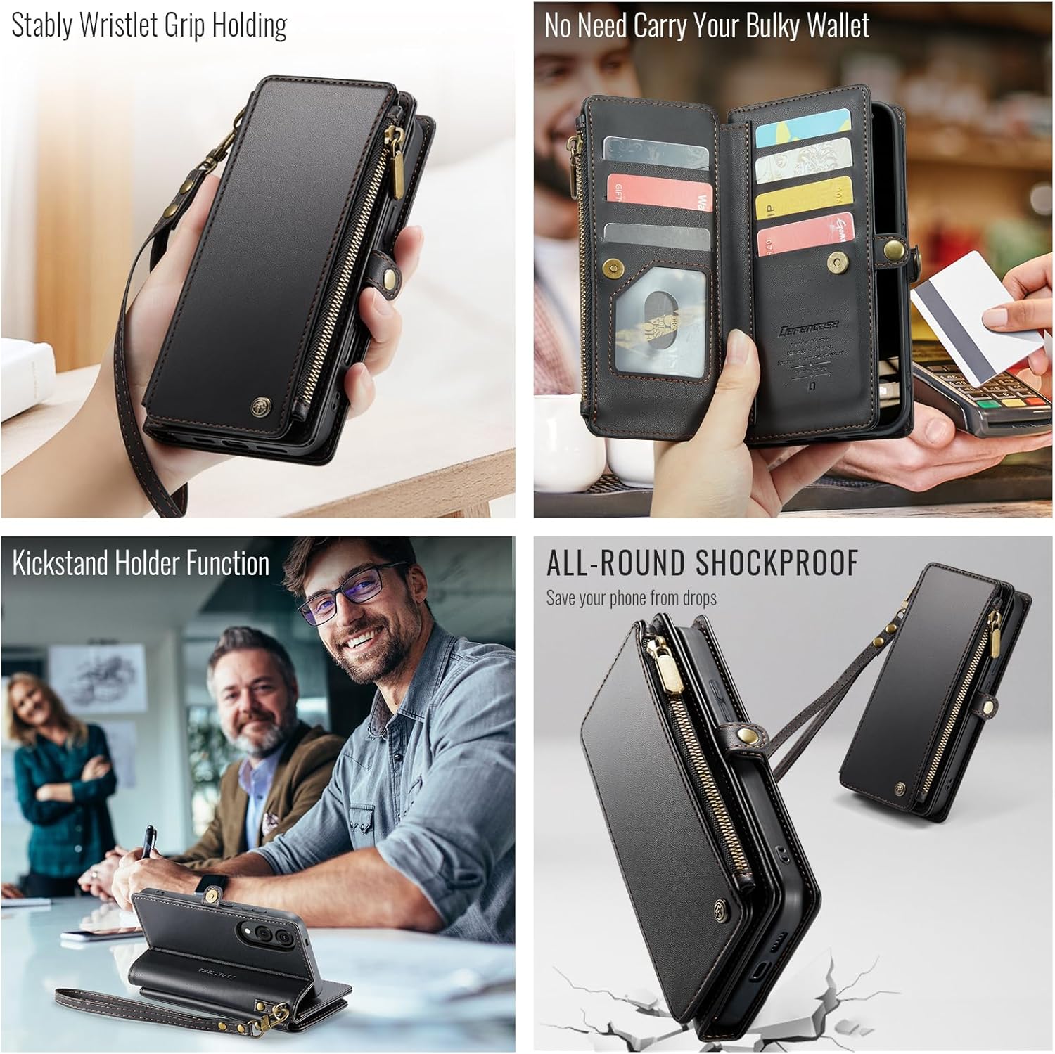 | Additional Features | Durable comfortable material, Lanyard Wrist Strap, RFID Blocking 10-Card Holder, Stand Function, Wallet with Zipper Pocket |