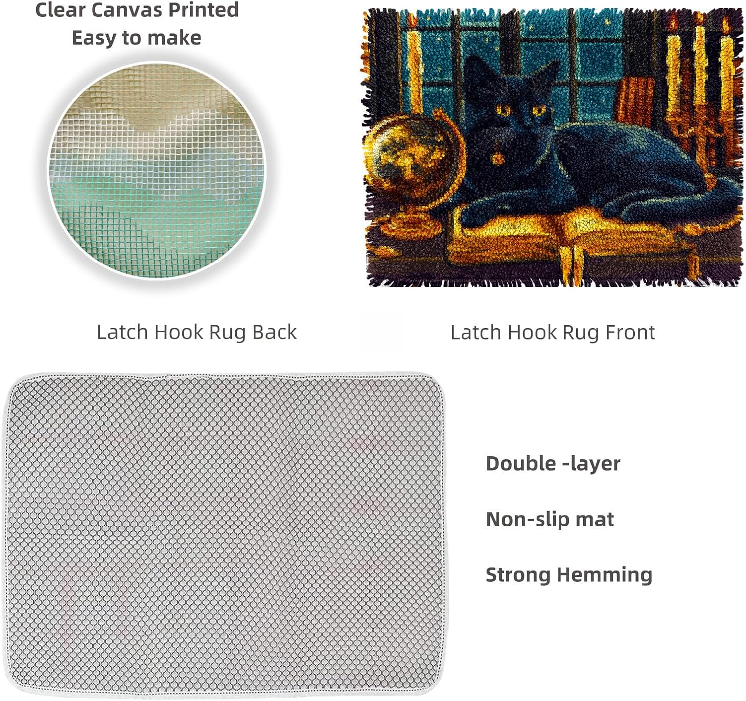 Experience the Joy of Crafting: DIY Latch Hook Rug Kits for Beginners and DIY Enthusiasts Perfect for DIY Enthusiasts DIY latch hook kits can give you a different life style. learn to reduce stress, emotional adjustment, enhance self-confidence and perseverance cultivate patience. Each latch hooking kit is a fun activity-just loop, hook and pull, it will be a great family project to create and develop your crafting skills! Now Start Your Artistic Adventure! Package includes: 1 * Stamped Rug 1 * Crochet Hook 1 * English Production instructions 1 * Enough Pre-cut yarns of different colors How to start my first latch hook kits? 1.Crochet hook into the grid 2.Fold the embroidery thread in half and hook it with a crochet needle. 3.Pull the embroidery thread out of the horizontal grid 4.The crochet hook hooks the tail of the embroidery thread 5.Pull the tail of the embroidery thread across the grid and out of the loop 6. Arrange and tighten the embroidery thread. Note: 1.Due to lighting conditions, monitor brightness and contrast settings, etc. The actual product color may differ slightly from the color shown on picture, please understand. 2.Please allow a little size error due to manual measurement.
