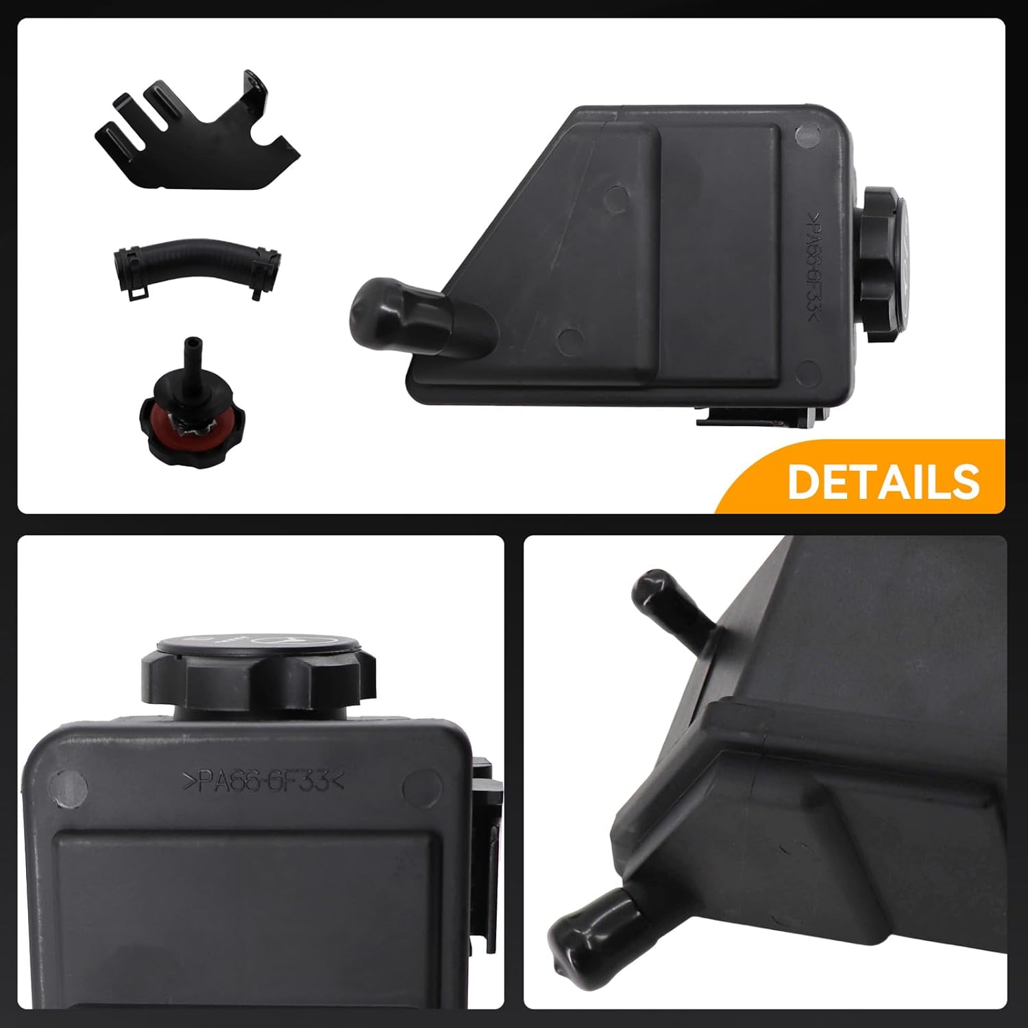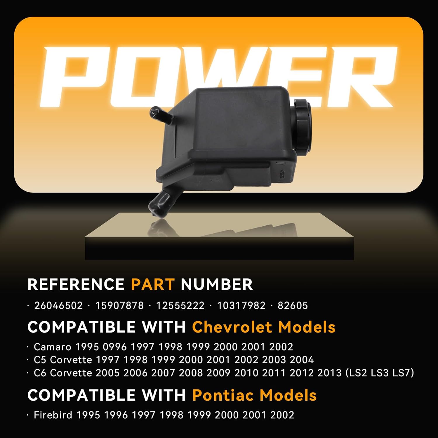 【Replacement Number】: 15907878, 26046502, 12555222, 10317982, 82605 【Fitment】: Compatible with Chevrolet Models Camaro 1995 0996 1997 1998 1999 2000 2001 2002 C5 Corvette 1997 1998 1999 2000 2001 2002 2003 2004 C6 Corvette 2005 2006 2007 2008 2009 2010 2011 2012 2013 (LS2 LS3 LS7) Compatible with Pontiac Models Firebird 1995 1996 1997 1998 1999 2000 2001 2002 【Direct replacement】: This power steering reservoir fits and functions like original equipment for a smooth installation 【Solid and Reliable】: The power steering tank is made of solid plastic and can tolerate high temperature and high pressure without deformation 【Note】: Please make sure the product is suitable for your car before purchase. If you are not sure how to install the parts or lack the necessary experience, please seek professional help