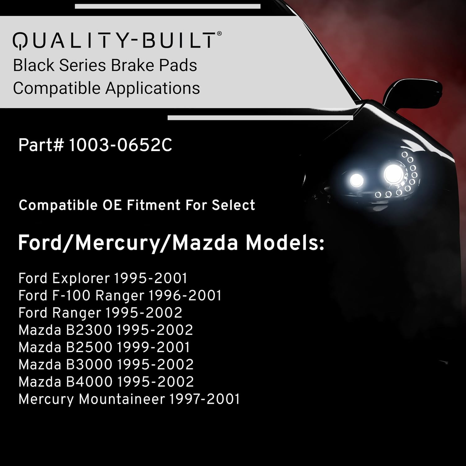 Step Up to Street-Ready Performance with the QUALITY-BUILT Black Series front ceramic brake pads. For drivers who expect more from their brakes - the Black Series delivers a premium, track-inspired braking experience in a street-ready package. Designed with enthusiasts and performance-minded DIYers in mind, these front ceramic pads offer more than just a factory replacement - they’re an upgrade you can feel in every stop. From the moment you open the box, every detail is purpose-built: premium materials, stainless steel hardware (included where required), and precise OE fitment ensure a straightforward install with long-lasting results. Whether you're dialing in your daily or refreshing your weekend project car, installation is smooth, and results are felt immediately. Pairing ultra-quiet operation with aggressive bite, the Black Series front ceramic brake pads are ideal for those who want low dust, quieter operation, and a sharper, but progressive, braking experience. These pads are built to withstand heat, resist wear, and maintain consistent pedal feel over time - no fade, no compromise. The result? Better control. Better feel. Better braking. When you want braking that matches your build - whether you're commuting, cruising or carving canyons, QUALITY-BUILT Black Series brake pads give you the performance you demand. Compatible with Ford Explorer 2001-1995, F-100 Ranger 2001-1996, Ranger 2002-1995, Mazda B2300 1997-1995, B2300 2002-2001, B2500 2001-1999, B3000 1996-1995, B3000 2002-1998, B4000 2002-1995, Mercury Mountaineer 2001-1997 (PART#1003-0652C) Verify FITMENT using AmazonConfirmedFit tool